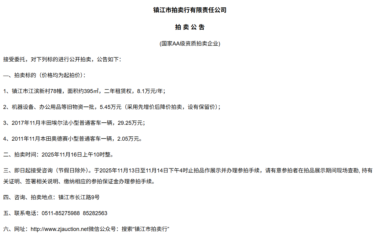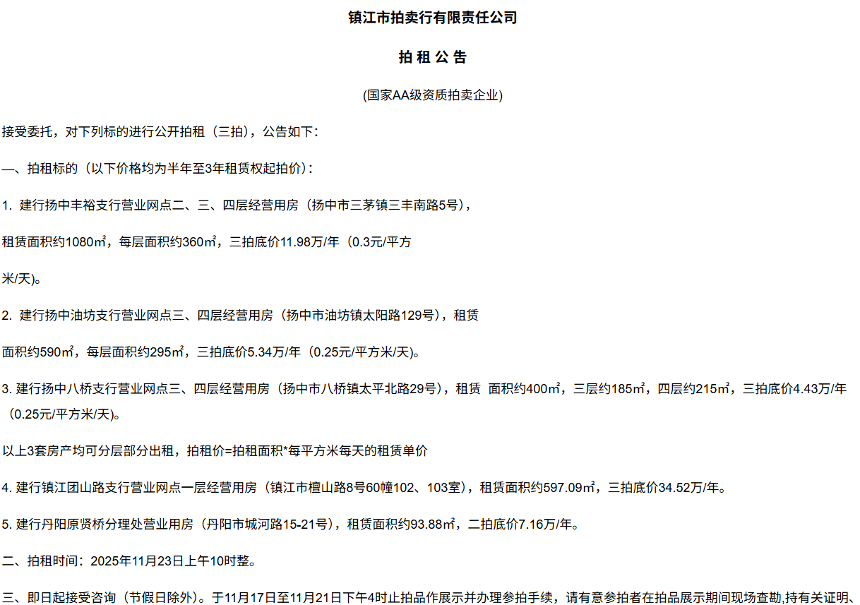 鎮江市拍賣行有限責任公司拍 租 公 吿(國家AA級資質拍賣企業)接受委托,對下列標的進行公開拍租(三拍),公告如下:—、拍租標的(以下價格均為半年至3年租賃權起拍價):1.  建行揚中豐裕支行營業網點二、三、四層經營用房(揚中市三茅鎮三豐南路5號),租賃面積約1080㎡,每層面積約360㎡,三拍底價11.98萬/年(0.3元/平方米/天)。2.  建行揚中油坊支行營業網點三、四層經營用房(揚中市油坊鎮太陽路129號),租賃面積約590㎡,每層面積約295㎡,三拍底價5.34萬/年(0.25元/平方米/天)。3. 建行揚中八橋支行營業網點三、四層經營用房(揚中市八橋鎮太平北路29號),租賃  面積約400㎡,三層約185㎡,四層約215㎡,三拍底價4.43萬/年(0.25元/平方米/天)。以上3套房產均可分層部分出租,拍租價=拍租面積*每平方米每天的租賃單價4. 建行鎮江團山路支行營業網點一層經營用房(鎮江市檀山路8號60幢102、103室),租賃面積約597.09㎡,三拍底價34.52萬/年。5. 建行丹陽原賢橋分理處營業用房(丹陽市城河路15-21號),租賃面積約93.88㎡,二拍底價7.16萬/年。二、拍租時間:2025年11月23日上午10時整。三、即日起接受咨詢(節假日除外)。于11月17日至11月21日下午4時止拍品作展示并辦理參拍手續,請有意參拍者在拍品展示期間現場查勘,持有關證明、簽署相關說明、繳納相應的參拍保證金辦理參拍手續。四、咨詢、拍租地點:鎮江市長江路9號五、聯系方式:0511-85275988   13655299933楊先生六、網址:http://www_zjauction_net.shuangyifushi.com;微信公眾號:搜索“鎮江市拍賣行” 拍品清單2025.11.23序號名稱起拍價(元)標的說明1建行揚中豐裕支行營業網點二、三、四層經營用房(揚中市三茅鎮三豐南路5號),租賃面積約1080㎡,每層面積約360㎡三拍底價11.98萬/年(0.3元/平方米/天)1、1-3號房產均可分層部分出租,拍租價=拍租面積*每平方米每天的租賃單價;2、意向競拍人在拍賣前需持營業執照或身份證與委托方說明租賃房產經營業態,確定意向后出具房產承租用途承諾書,經委托方審核后,方可交納保證金參加競拍;3、租賃期限為半年至3年(承租方與出租方協商而定),承租方每半年或一年結付租金,租賃期間的水、電費用及其它相關費用均由承租方承擔;4、承租方不得用于經營和保管危險物品,不得用于開設餐飲、娛樂等可能嚴重影響消防安全、運營安全的經營業態,不得用于經營委托貸款、小額貸款等可能冒用委托方名義,帶來聲譽風險的經營業態。租賃期內,承租方不得破壞墻體結構,自行成就消防、安全等使用條件,不得擅自將租賃房屋轉租、轉讓給他人使用,否則委托方有權收回房屋;5、拍租成交后,承租方將租金交至出租方指定賬戶,傭金交至拍賣方賬戶(拍租傭金為該房屋一個月租金)。承租方憑租賃合同無息退還保證金。2建行揚中油坊支行營業網點三、四層經營用房(揚中市油坊鎮太陽路129號),租賃面積約590㎡,每層面積約295㎡三拍底價5.34萬/年(0.25元/平方米/天)3建行揚中八橋支行營業網點三、四層經營用房(揚中市八橋鎮太平北路29號),租賃面積約490㎡,每層面積約245㎡三拍底價4.43萬/年(0.25元/平方米/天)4建行鎮江團山路支行營業網點一層經營用房(鎮江市檀山路8號60幢102、103室),建筑面積約597.09㎡三拍底價34.52萬/年5建行丹陽原賢橋分理處營業用房(丹陽市城河路15-21號),建筑面積約93.88㎡二拍底價7.16萬/年